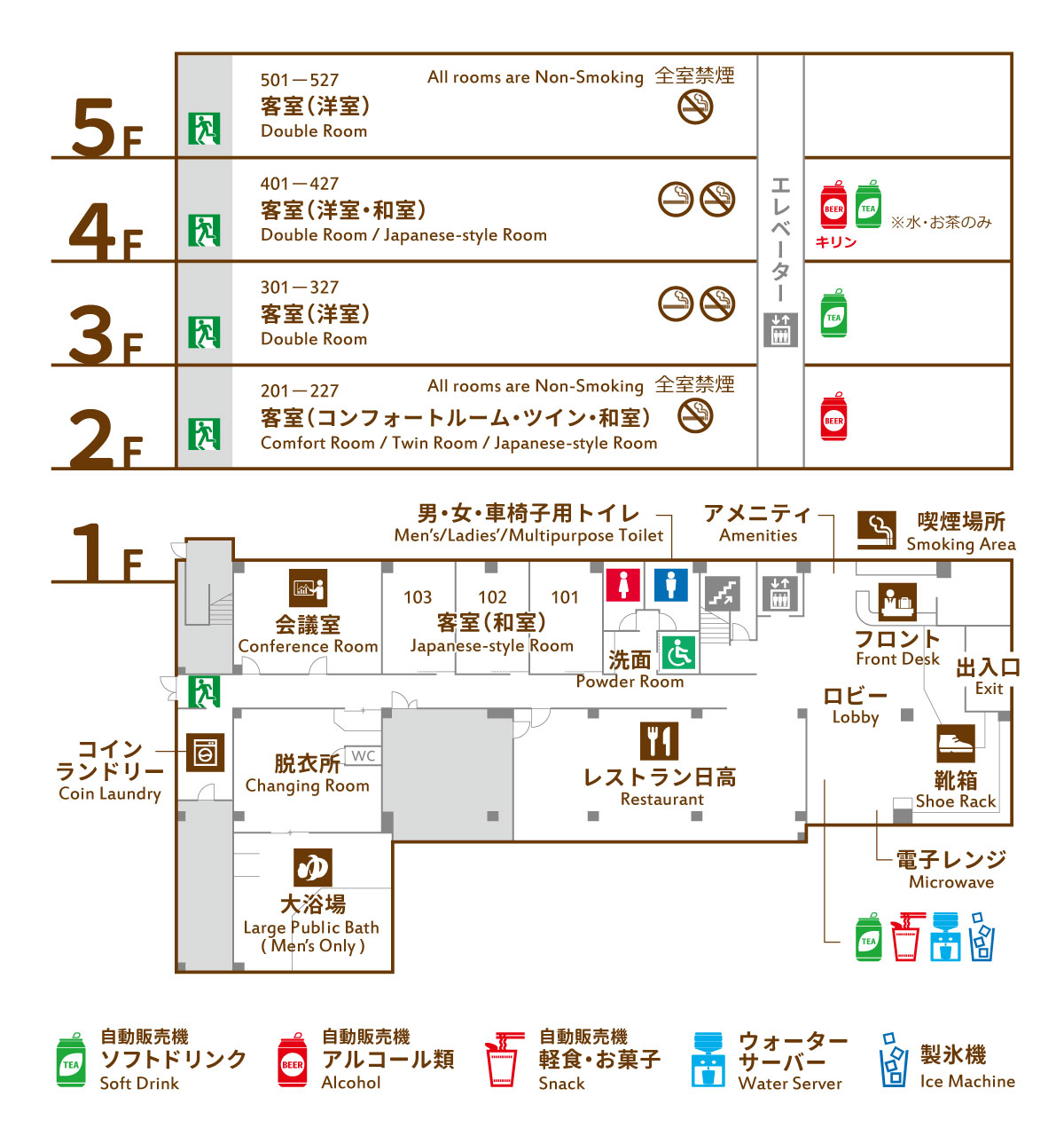 | 1F | Japanese-style Room Non-Smoking/Front Desk/Lobby/Restaurant/Large Public Bath/Coin Laundry/Conference Room/Multipurpose Toilet/Vending Machine(Soft Drink・Snack)/Coffee Maker/Water Server/Ice Machine/Microwave Oven/Amenities |