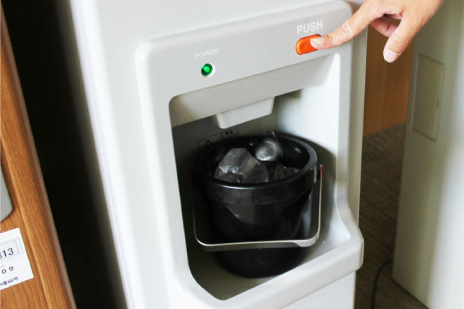 The ice machine is in the lobby. You can borrow an ice pail at the front desk for free. Please feel free to ask.